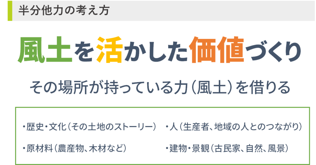 「半分他力」とは、自分の力だけでなく、その土地が持つ力も借りるということ。