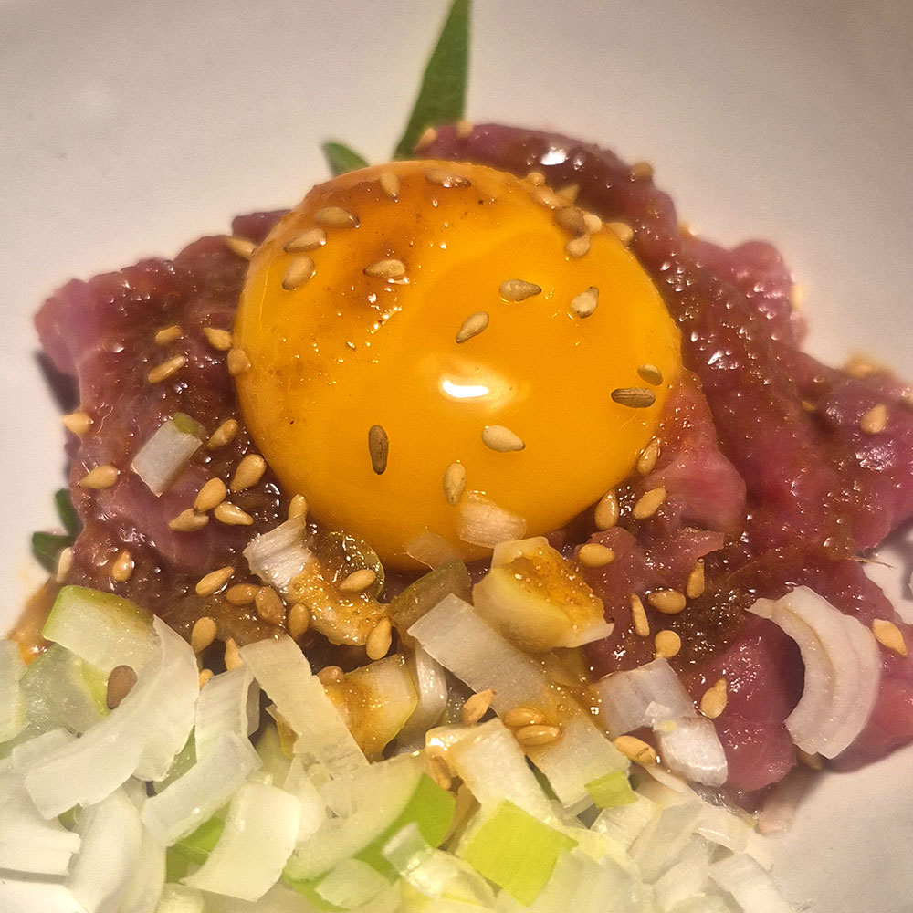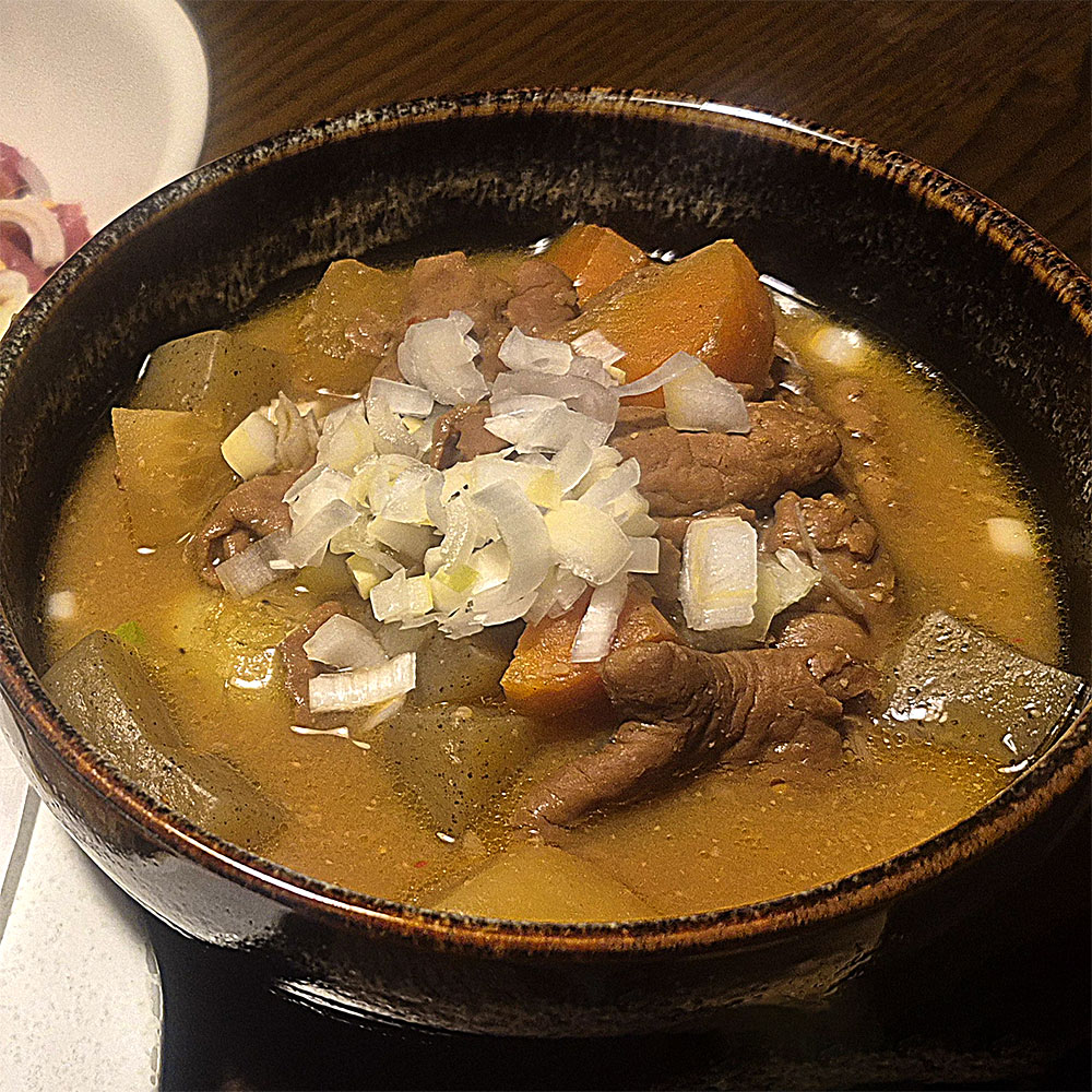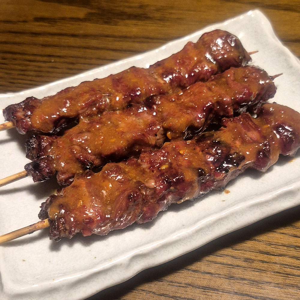 焼き鳥(かしら)に辛味噌を付けて食べたり、馬刺しのユッケやもつ煮などなど…。